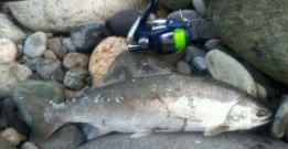 50m程先でヒット強引に寄せて 河原に引き上げました いいプロポ−ションしています 写真を撮っている時、思わず感謝の念が湧きました 4時50分ヒット |