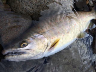 渇水の中、2匹釣れました。 今回も40cm未満、痩せて、ガリガリでした。 写真上側のアマゴ32cmも一緒の場所です。 |