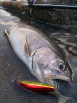 釣り友とルア-F、すると何やらデカいやつがヒット 10分程かけて手元に(^_-)-☆ 口からは小魚が・・・ ヒットルア- リュウキ60s:ライムグリ-ン |