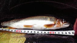 鮎釣りでサツキマスが掛り 右往左往だいぶ粘りましたが 最後にプッツン・・・残念 鮎の最大は21.5cm90g |